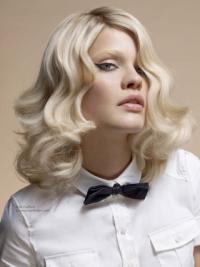 The large waves are in synch with each other and form a beautiful rhythm in their flowing motion. The color is a neutral, but very diva platinum and vanilla blonde with a matte sheen. This haircut offers high versatility and can be styled in many different ways and it is even long enough to be pulled into a ponytail or an updo.