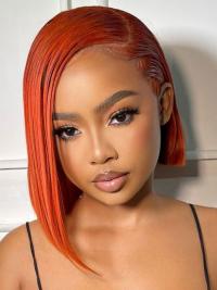 The sleek, straight styling enhances the vibrant copper hue, creating a high-fashion look with a modern edge. The deep side part adds volume and drama, while the longer front section brings an elegant, face-framing effect.