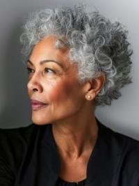 This hairstyle is a stunning showcase of short, tight silver curls that blend elegance with a touch of boldness. The softly tapered cut adds structure and definition, keeping the focus on the voluminous curls at the crown. The natural silver tones enhance the texture beautifully, giving it a luminous and confident look.