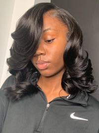 Big swooped curls with a side part give this bob a soft, romantic touch. The dark, shiny strands add a silky finish that reflects light beautifully and works well with all skin tones.