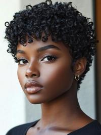 This defined curls pixie cut is a stunning way to embrace natural texture while keeping things short and effortlessly stylish. The tight, well-moisturised curls create a voluminous yet structured look, framing the face beautifully.