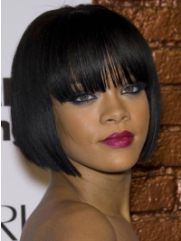 The compact, short and straight hair looks very modern, featuring a full bang. The full, blunt bangs are tidily trimmed before the forhead. This chin-length bob perfectly frames the face. Pointed and layered ends allow for the most natural movement and flow. The open wefting in the sides and back of cap is breathable and comfortable. Each hair is individually hand-knotted to the base cap, allowing for extremely natural movement, even for sensitive scalps.