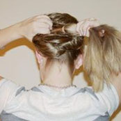 If your updo has a drawstring, pull both draw strings until the piece is secured to your own hair. Tie strings together and tuck them inside your updo.
