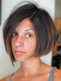 This adorable chin-length asymmetrical bob is a standout style, offering a creative twist on the traditional bob with its uneven lengths.