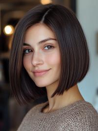 A deep side part adds a dramatic touch to this classic dark chocolate blunt bob, creating volume and sophistication.