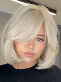 This platinum blonde bob is a stunning choice. The swooping bangs create a soft frame around the face, adding a touch of sophistication to the look.
