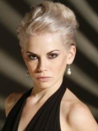 The high-toned effect of platinum silver hair is magnified by elaborate lines of sleekness moving only a touch from the part and away from the face. The top has a casual dip with all poufs remaining completely intact. The hair is brushed back and over the ears with a very short neckline. This fashionable short haircut is the work of a true artist.