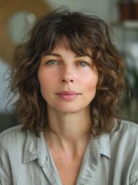 This long French bob is accented with soft, wispy fringe that gently frames the eyes, adding a romantic touch. The tousled waves give it a carefree, natural texture, making it a versatile choice for both everyday wear and special occasions.