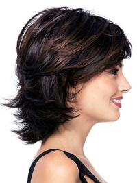 This wig has all-over layering. It is a barely waved, medium length shag featuring flipped textured ends throughout.