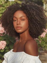 The tight ringlets in a round afro shimmer with soft brown and faint rose-gold undertones that peek through naturally in the light.