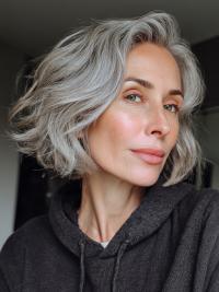 A neck-length bob styled with subtle, broken waves and a cool silver ash tone creates a chic, sculpted look that enhances grey gracefully.