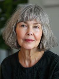 This classic blunt bob exudes timeless charm with its even cut and slightly textured finish. Falling just below the chin, it creates a clean, polished frame for the face. The soft bangs gently skim the brows, adding a touch of playfulness while blending effortlessly into the sleek silhouette. The natural gray hue gives the style a sophisticated, graceful glow.