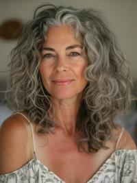 Radiate elegance with this sophisticated curly hairstyle that features a beautiful blend of silver and grey hues.