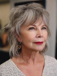 She has a stylish, layered shag haircut with gentle, wispy bangs and textured gray hair that gives her a contemporary, polished look.