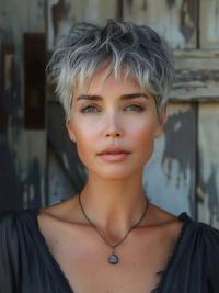 If you’re looking for a bold and daring hairstyle, the pixie is the way to go. It’s a fantastic way to add a bit of an edge to your look while keeping it stylish and modern. Especially with gray hair, adding a cool, contemporary twist.