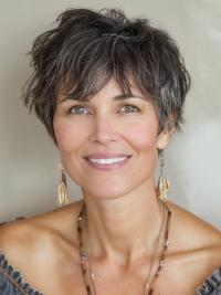 The textured pixie with short bangs is an edgy, low-maintenance short hairstyle. This cut features textured layers and short, choppy bangs. It’s perfect for those who want a bold look that requires minimal styling.
