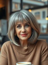 The bangs add a bold, modern touch, creating a polished look that' s perfect for anyone seeking a refined and stylish cut.