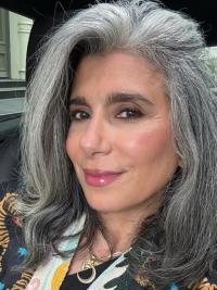 Beautifully layered gray hair drapes elegantly over the shoulders, exuding both confidence and sophistication.