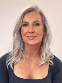 The hairstyle combines silver and grey tones with gentle, tousled waves flowing from a natural part. The silver highlights blend smoothly throughout, adding depth and texture to the casual yet put-together look.
