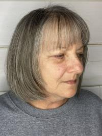 The bangs add a bold, modern touch, creating a polished look that' s perfect for anyone seeking a refined and stylish cut.
