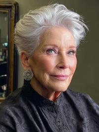 She has a stylish, full-bodied pixie cut with gentle, swept-back layers that highlight the texture and shape of her hair.