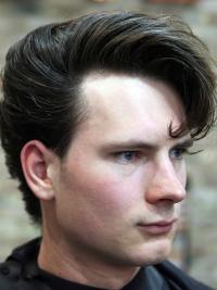 A timeless style featuring neatly parted hair combed to one side, with the sides trimmed short.