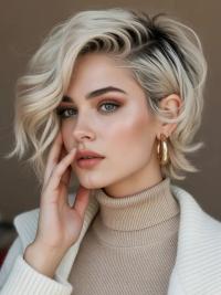 This contemporary version of the pixie – a side-sweeped wave, like a breath of warmth in. The blonde shade providing this appearance with a dimension that makes round face look great in addition to brightening a dull light instantly. The wavy hair texture is soft and moving and provides volume.