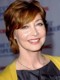 This is a beautiful shoulder-hitting style that has softly waved layers. Its bangs have been parted from the forehead hairline, hitting the brows and ears. It is a feminine look that highlights every woman's best features.