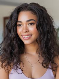 Soft curls add volume and soften angular features. This curly style is layered for fullness and movement. Brings playful elegance to your look.