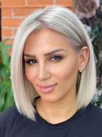 A snappy chin-length bob in a smooth grey color—is a sleek and chic look. Blunt-ended and smooth-styled and straight, this cut is sophisticated-looking, but a subtle tuck behind the ears prevents it from growing too done-up.