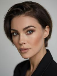 The sleek, slicked-back pixie hairstyle emphasizes a minimalist yet polished vibe, which is great for women who prefer an effortless yet powerful hairstyle.
