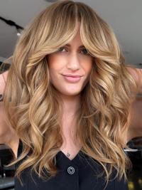 This hairstyle features golden blonde layers that cascade gracefully, complemented by soft, flowing curtain bangs. The voluminous waves add a sense of drama and sophistication, while the curtain bangs frame the face for a chic, balanced look.