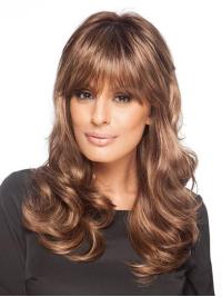 It is a long, layered, and wavy wig with a full bang. Smoothness at the root transitions to loose curls at the ends. Shorter layers on top create luscious volume. This wig features a monofilament crown and is ideal for average head size. The density of the ready-to-wear synthetic hair looks more like natural hair and requires little to no customization or thinning.