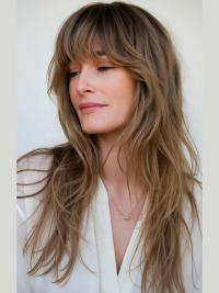 This long haircut features soft layers that create natural movement and dimension. The bangs delicately frame the face, giving it a modern yet timeless feel.