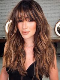 This bangs and caramel highlights. A gorgeous style with textured highlighted hair that goes as well with thick piece-y bangs as peanut butter goes with jelly.