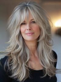 Soft waves, long length, and a sweet fringe make it cozy-chic.