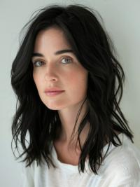 This shoulder-length style features soft, flowing waves that add effortless movement and texture. The deep, rich black color enhances the shine and gives the hair a sleek, polished look. A subtle middle part creates balance, while the face-framing layers gently highlight the natural beauty of the face.