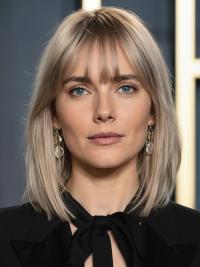 For a bold and trendy look, this mid-length haircut with layers and a full fringe is stunning. The layers create a dynamic look, adding volume and texture.