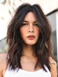 Medium Brown Human Hair Wigs Layered Wavy Monofilament Wigs