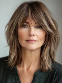 This shag haircut combines textured layers with bangs, adding depth and dimension to your brown hair. The highlights introduce a touch of brightness, enhancing the overall look.