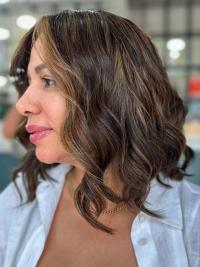 Rich brunette tones and soft waves make this long bob a striking, statement look. It’s luxurious, sophisticated, and perfect for a simple yet polished hairstyle.
