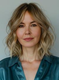 Featuring soft, tousled waves and effortlessly chic French bangs, this long bob is the ultimate Parisian-inspired hairstyle. The curtain-style bangs part gently in the center, blending seamlessly into loose layers that add texture and volume.