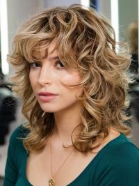 This layered hairstyle combines bouncy curls with a soft fringe for a playful and voluminous look. The warm blonde tones and textured layers add dimension and depth to the style.