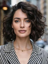 Embrace natural curls with this mid-length haircut featuring layers that enhance the curl pattern. The dark brunette shade adds richness and depth, while the layers create volume and movement.
