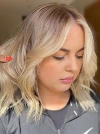 Shoulder-length waves add softness and movement to your hairstyle. The waves create an illusion of length, which helps to slim down a round face and distract from a double chin, giving you a balanced and elegant look.