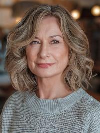 This shoulder-length cut with soft waves is a timeless and flattering choice for women. The side-swept style adds volume and movement, creating a beautifully face-framing effect.