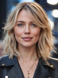 The wavy blonde hair in this style is enhanced by the layers, creating a full and voluminous look. The subtle waves frame the face perfectly, making it suitable for various face shapes.