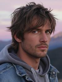 His haircut is a laid-back, messy layered look with tousled bangs for a cool and effortless vibe.