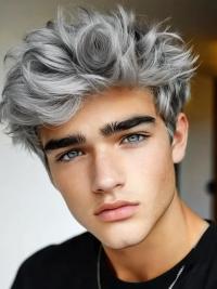 His hairstyle rocks a laid-back, wavy look with a longer fringe swept to the side, giving off effortless, beachy vibes.