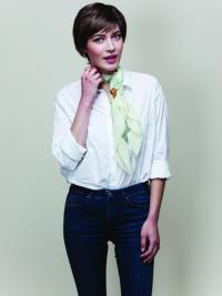It is a short style that features all over layering with tapered sides and nape. The loose layers give this romantic boycut style a casual, light look and feel that is both attractive and fun.